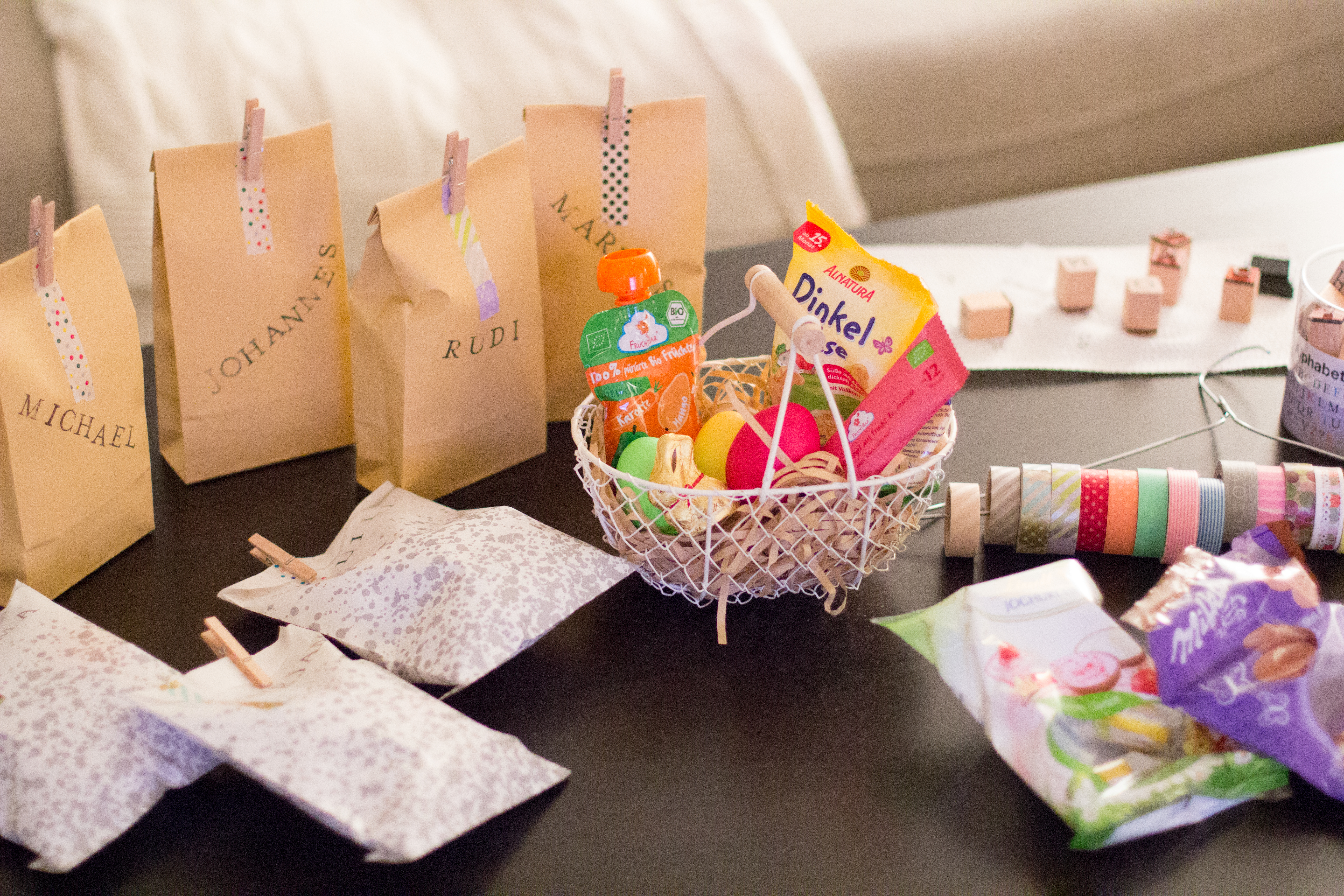 This past weekend we celebrated Easter with my family at my brother’s place in Switzerland. I didn’t want to bring too many chocolates and eggs, but I did want to bring a little something. So I dyed some last minute Easter eggs and bought a few chocolate eggs and bunnies. Since it was all very last minute (and I didn’t think about buying baskets or anything), I went through my crafting shelves and found some paper bags that I ended up using to put the eggs and chocolates in.