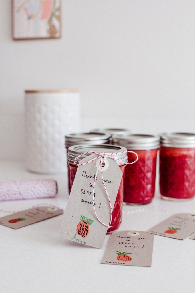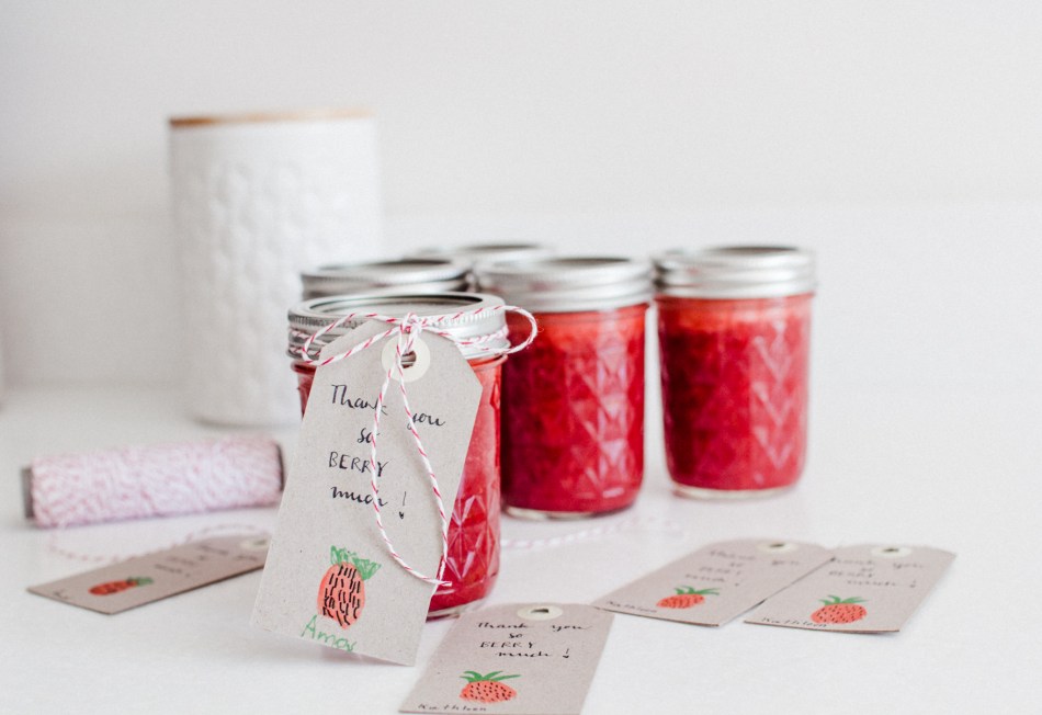 Falls jemand von Euch noch auf der Suche ist nach einem einfachen, aber leckeren Geschenk für Erzieher:innen oder Lehrer:innen oder sonst irgendwen, dürft Ihr mir das gerne nachmachen 🙂 Ihr braucht nur Gläser, Band und Anhänger. Marmelade mache ich einfach nach dem Rezept auf der Gelierzucker-Packung. Die Erdbeeren auf den Anhängern hab ich die Kinder machen lassen: Fingerabdruck mit roter Wasserfarbe und dann mit Stiften zur Erdbeere verzieren. Auf Englisch hat sich der Spruch „Thank you so berry much“ angeboten. Auf Deutsch könnte man zum Beispiel einen „beerenstarken Sommer“ wünschen oder sich für ein „beerenstarkes Jahr“ bedanken. Oder das Wortspiel einfach ganz weglassen 😉